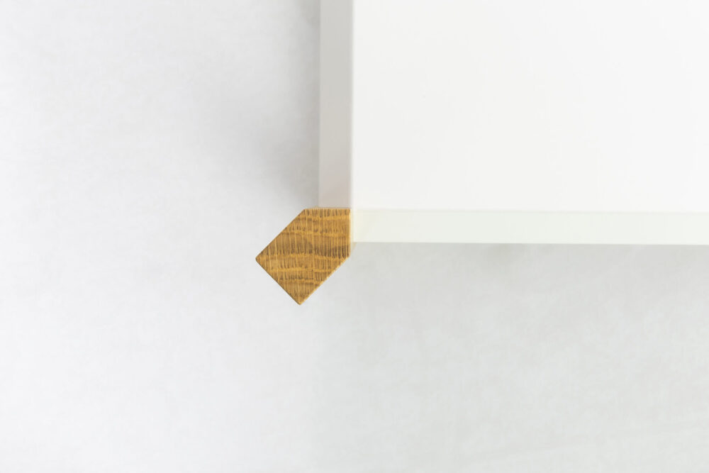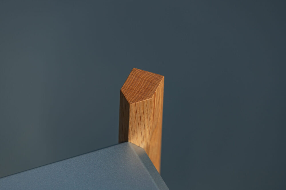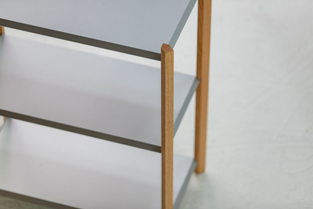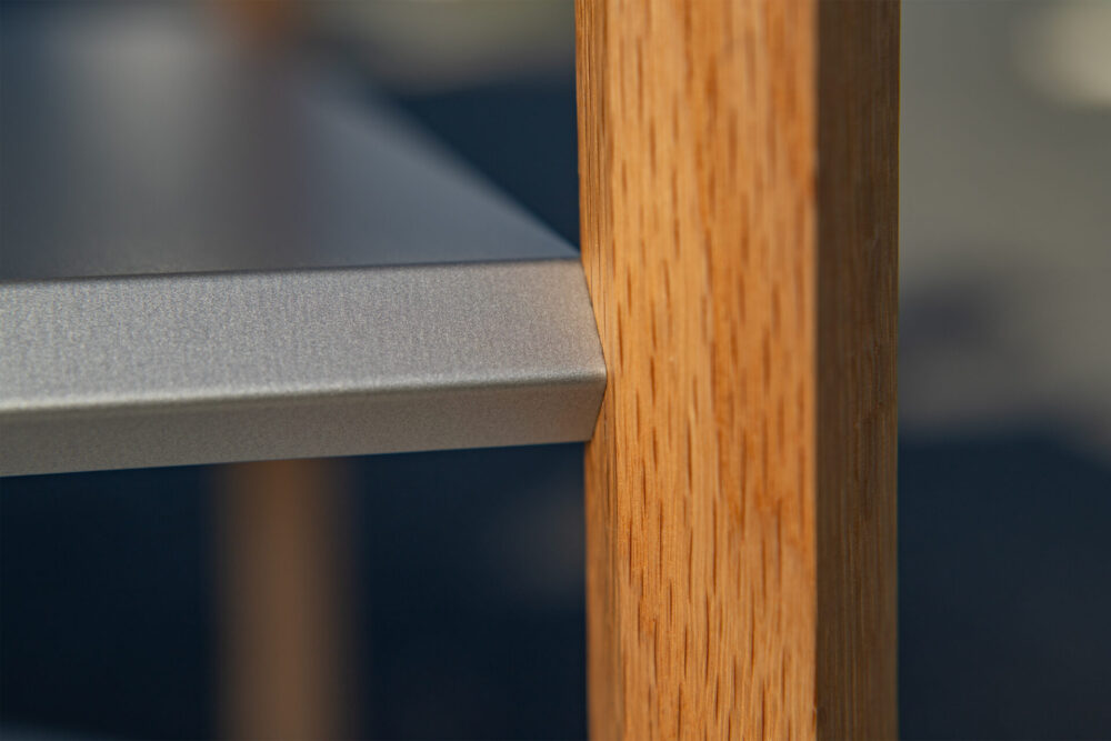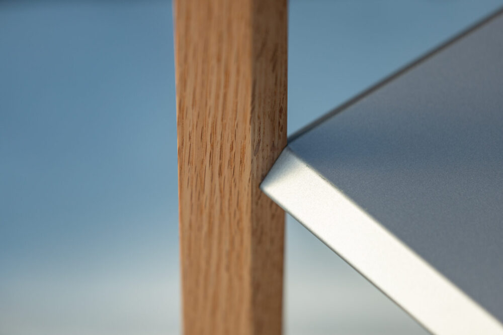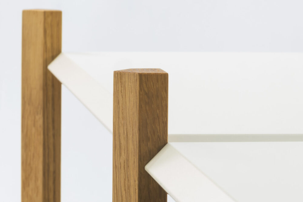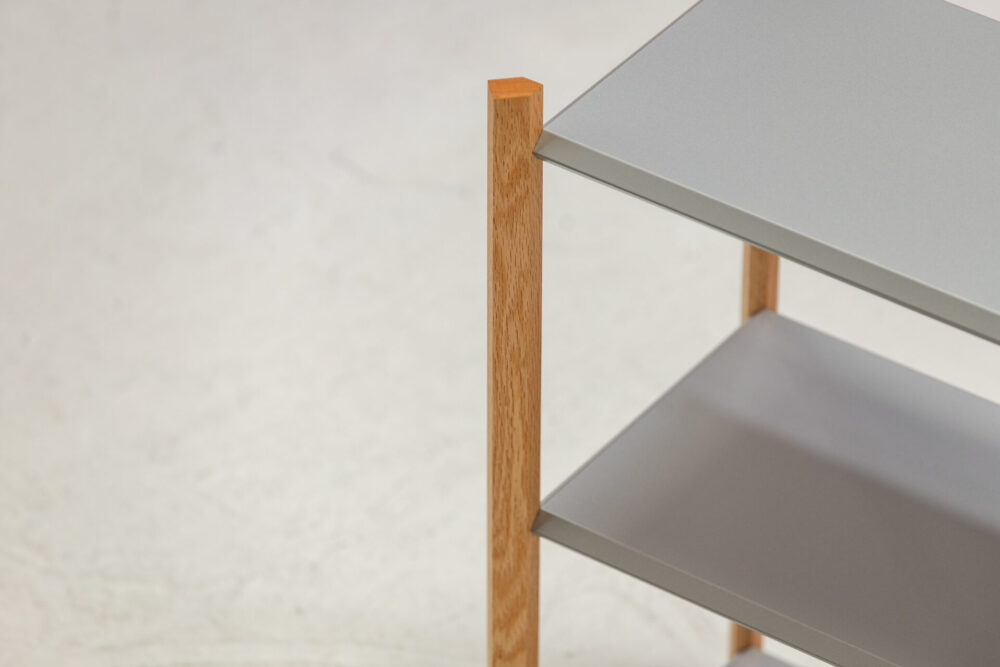 スチール板の斜め折りと木材による美しいプロダクトである。垂直に伸びる木材の面の方向が斜めになっていることから、落ちる陰影が複雑になることで、その構造や素材感を楽しむことができる。建築資材をそのまま用いた天板、あえて無塗装の裏面などの無骨さを無骨なままの魅力にせず、技術と特性を活かすことで美しさへ昇華させる技術とセンスが素晴らしい。連結による拡張性もあり、今後の展開に期待できる。