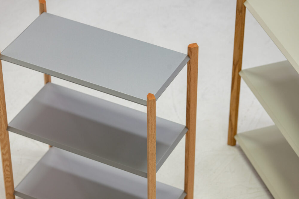 直線基調でスチール折りが美しく機能するシェルフ。斜めに折り曲げられた天板は、特徴的でありながら主張しすぎないシンプルなシルエットで置くものの魅力を引き立てます。無限に連結可能な機能性を生かした壁面収納や、空間を仕切る間仕切りなど多様なシーンに対応します。