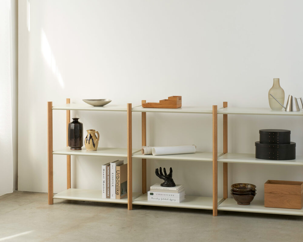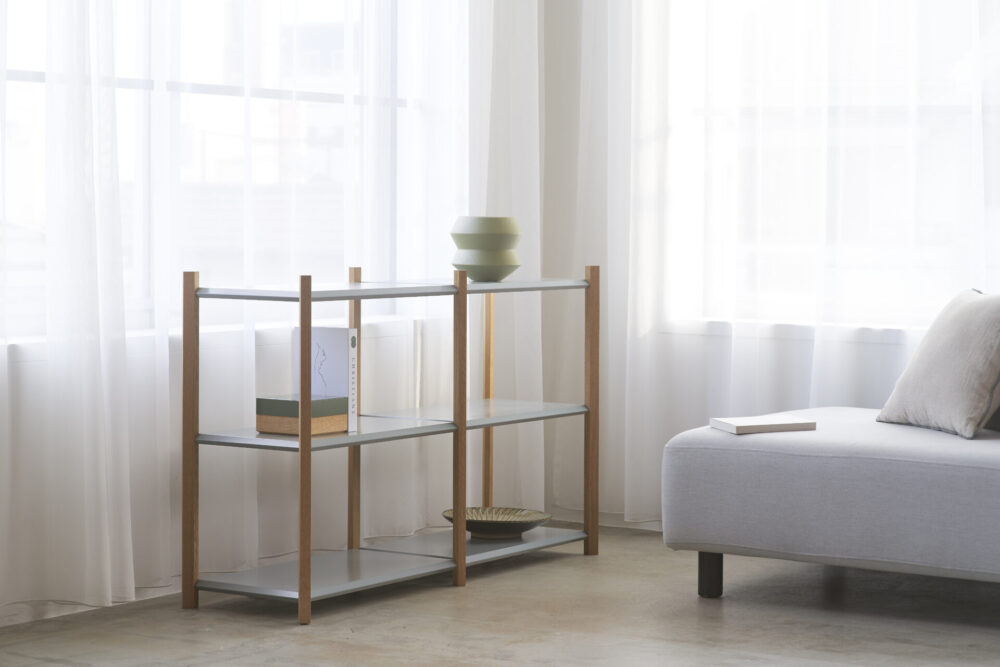 また最小限のパーツで構成されており、簡素化されたミニマルな構造で簡単に組み立て、連結が可能です。連結することで配置する空間や用途に合わせて棚数を選ぶこともできます。