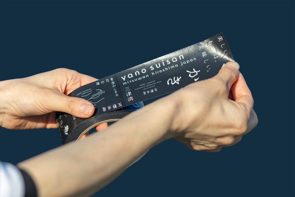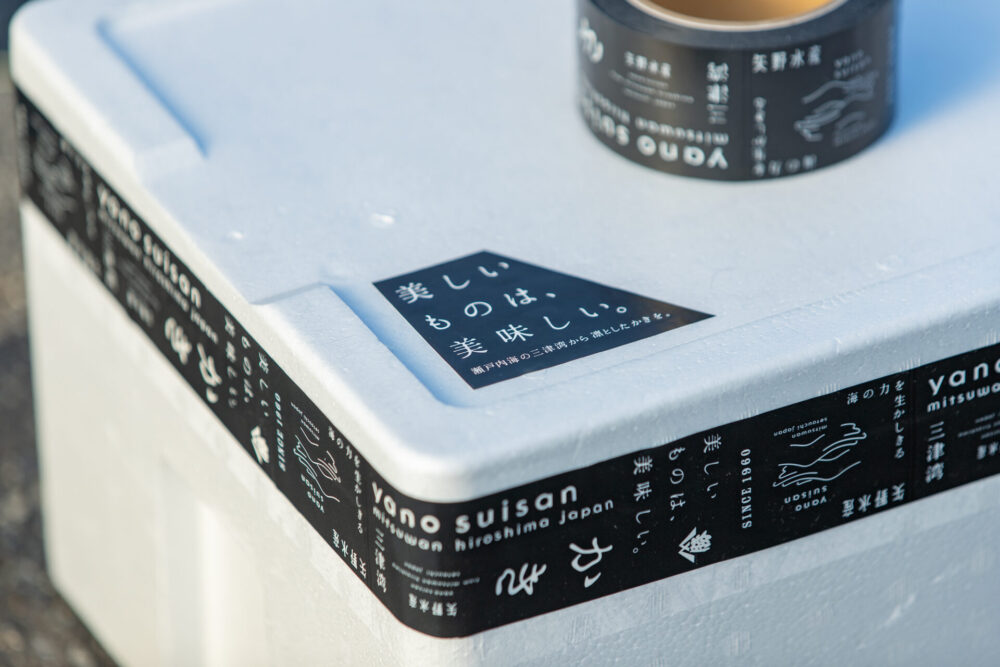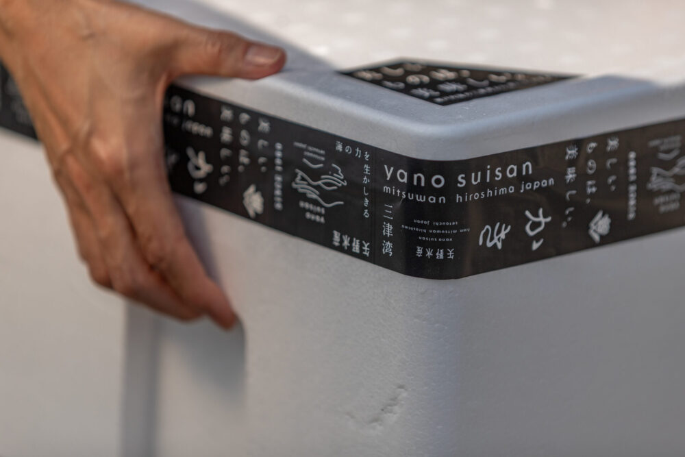 1960年創業、広島・三津湾で採苗から養殖・加工・選別・出荷・販売まで一貫して行う矢野水産の牡蠣を梱包する発泡スチロールに、オリジナルのテープを巻いたパッケージデザイン。最小限の資材で、ブランドの世界観を届けます。
