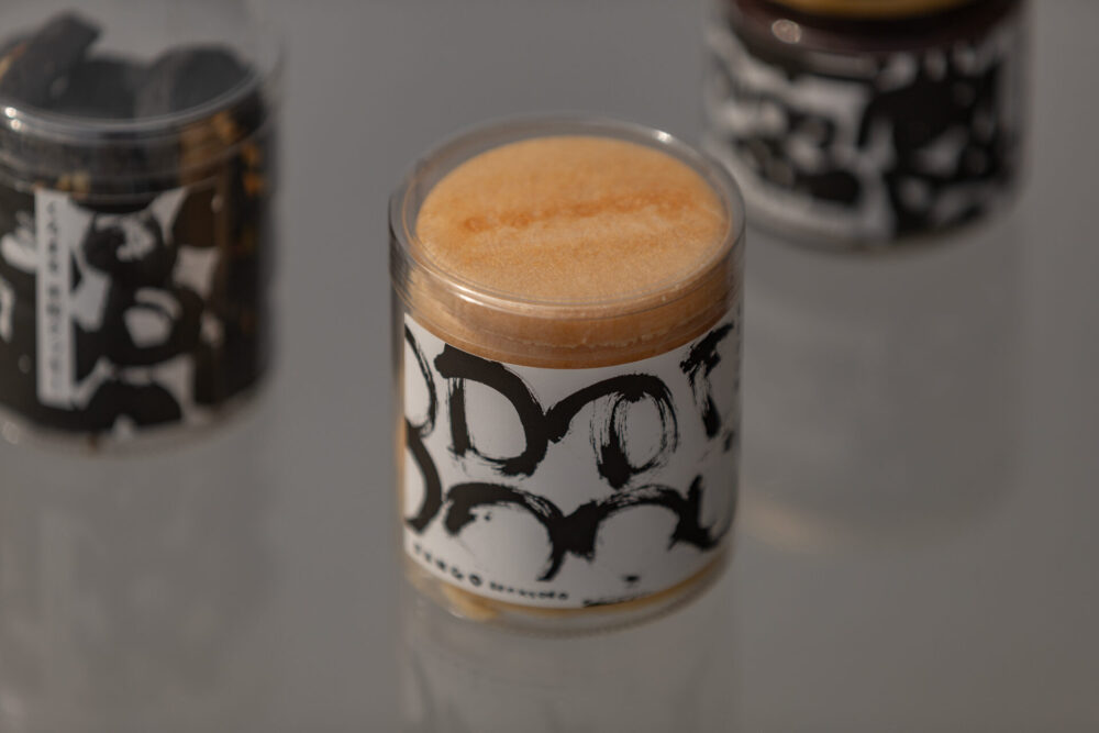 広島県産の牡蠣や削り節・利尻昆布などで出汁をとった、こだわりのタレを使った「みたらし団子」が名物です。みたらし団子の他にも米粉クッキーや最中もありますが、どの商品にも共通のグラフィックを用いることで、ブランド全体で昔ながらの和菓子のイメージを払拭し、新たな和菓子の魅力を表現しています。