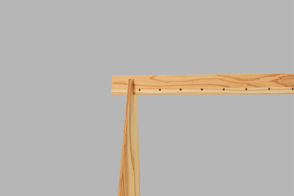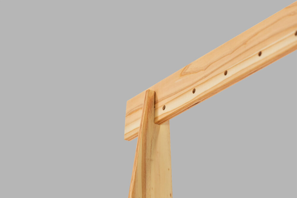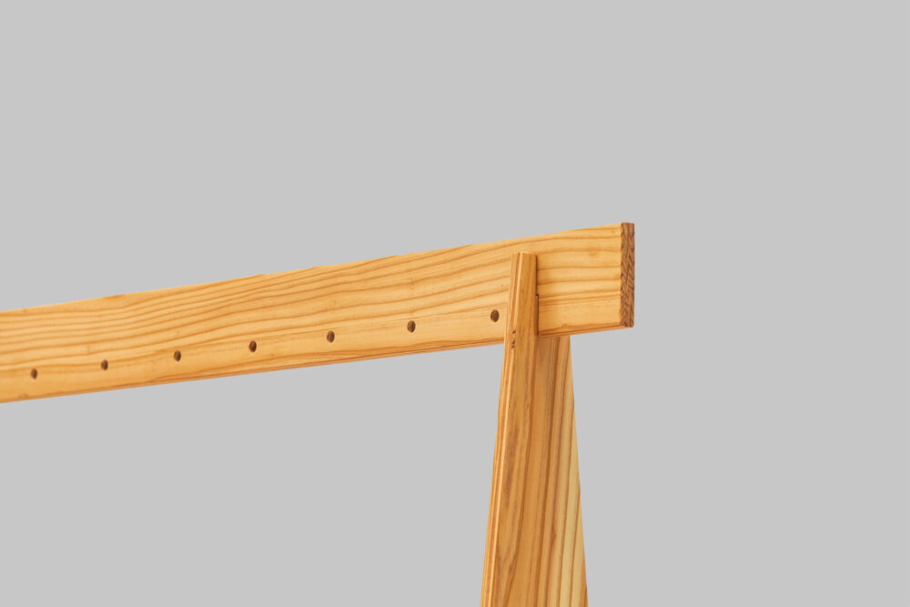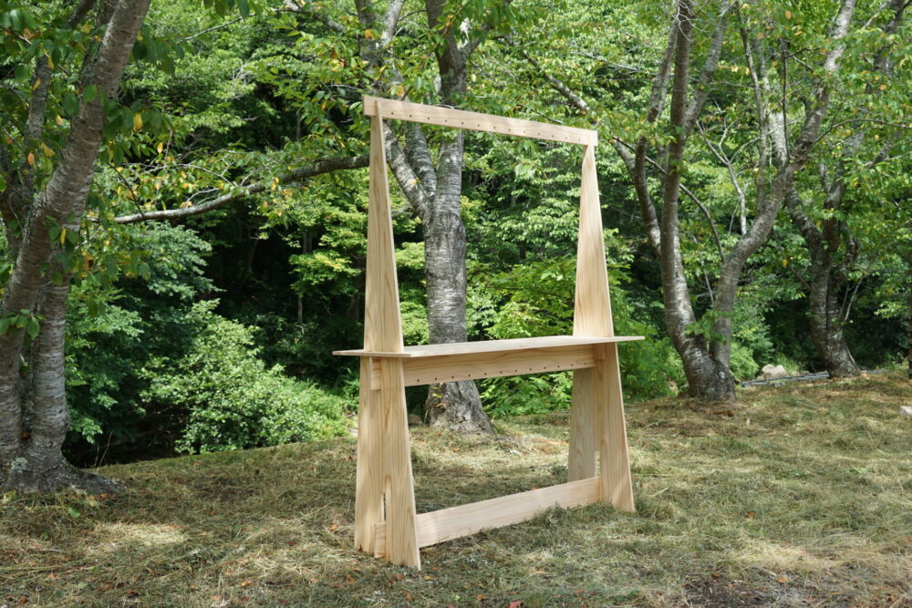 軽量で組立式の簡易な構造の中に、強度を保つためのホゾや相欠き技術が盛り込まれていることが特長です。容易に分解もでき、パーツをまとめると最小で150cm×55cm×4.5cmまでコンパクトになり、重さも1.6kgなので1人でも持ち運びが可能です。