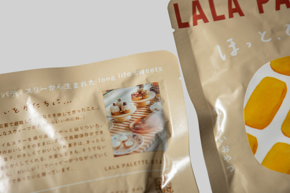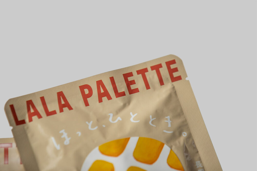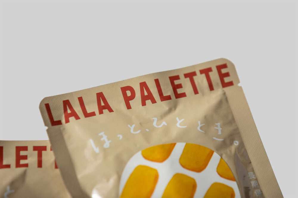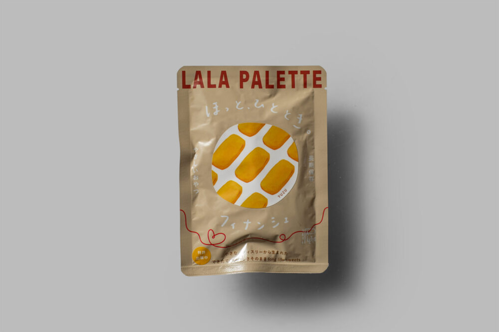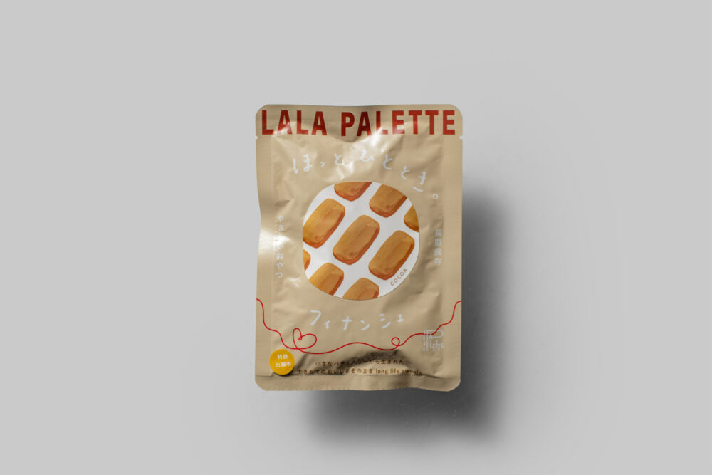 LALA PALETTEは、東広島市にある焼き菓子のお店。その小さなお菓子工房から生まれた手作りのフィナンシェを、特許申請中の特殊技術で、添加物を使わない、素材の美味しさそのままに常温で長期保存を可能にしました。賞味期限は製造より4年。パッケージは、優しい美味しさが伝わるようにイラストとともにお菓子について表現しています。