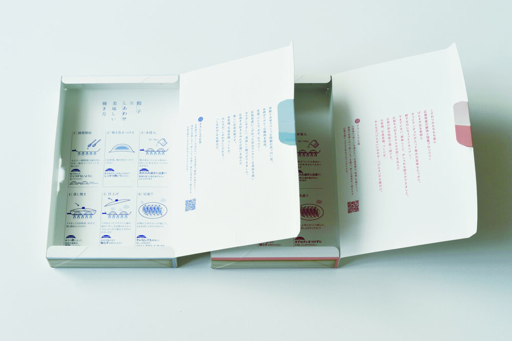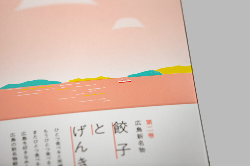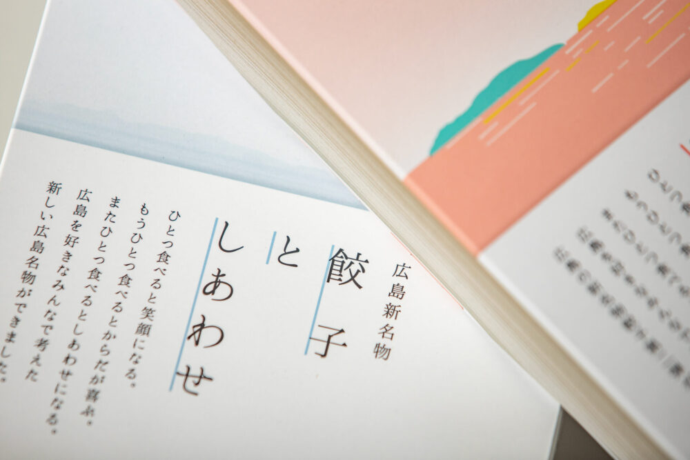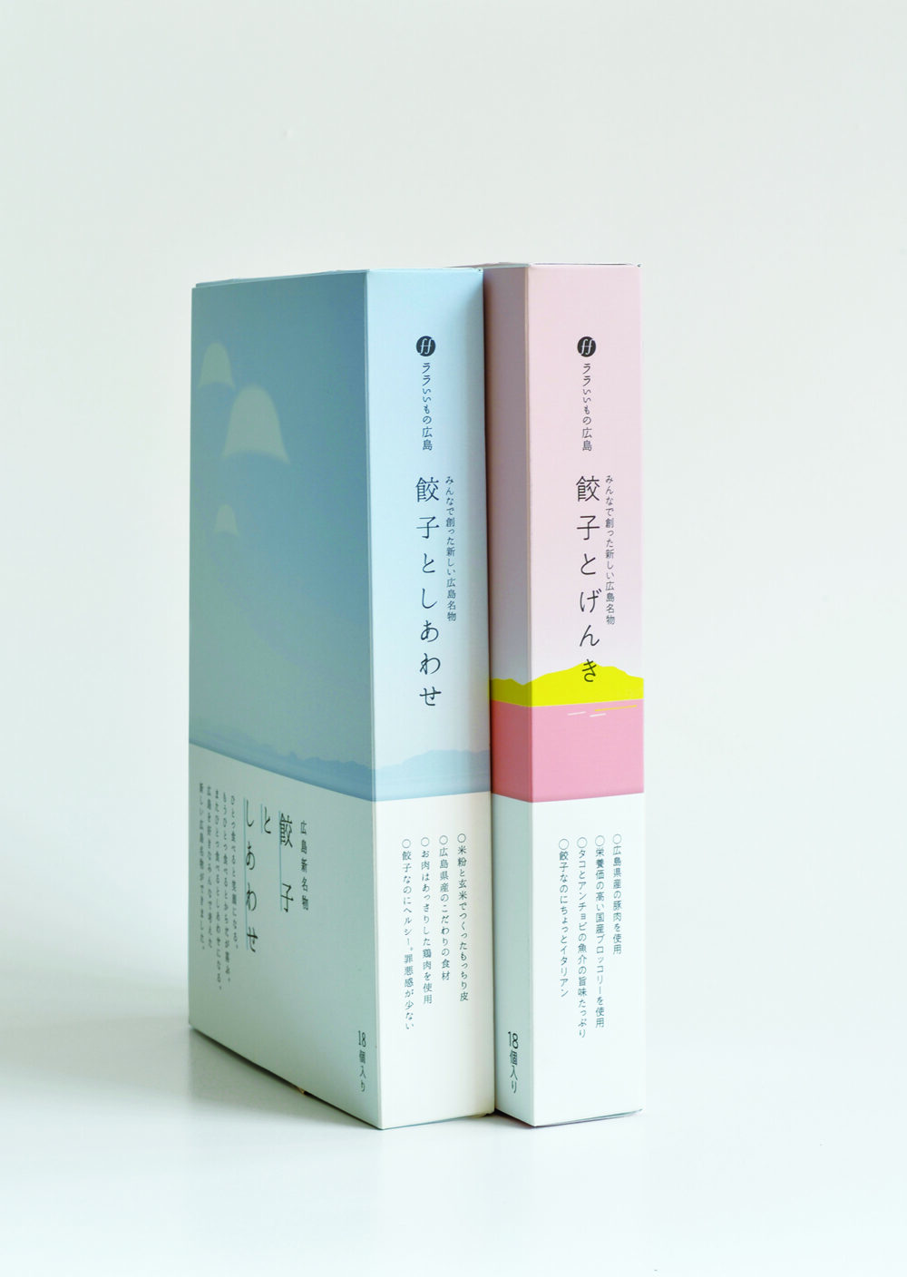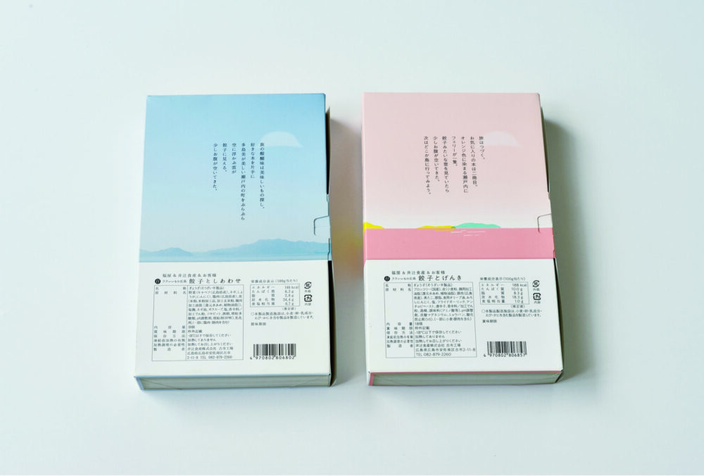 今までにない餃子のパッケージは、試行錯誤しながらの開発ストーリーをイメージして、餃子らしくないBOOK型にしました。広島を象徴する瀬戸内の風景を写真とイラストで表現し、コピーは瀬戸内を旅する小説風にしました。お土産や贈答品としても喜ばれています。