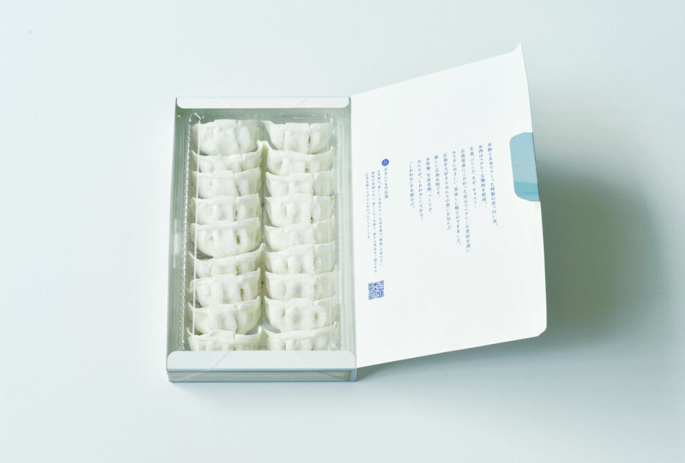 「カラダにいい冷凍餃子」をコンセプトに開発された商品。一般の客を入れての共創プロジェクトで、たくさんの意見や本音を引き出し、その声を見事に商品化している。餃子市場の一般的なパッケージとは対照的に、言語で紡ぐ小説風なデザインは非常にユニークである。
