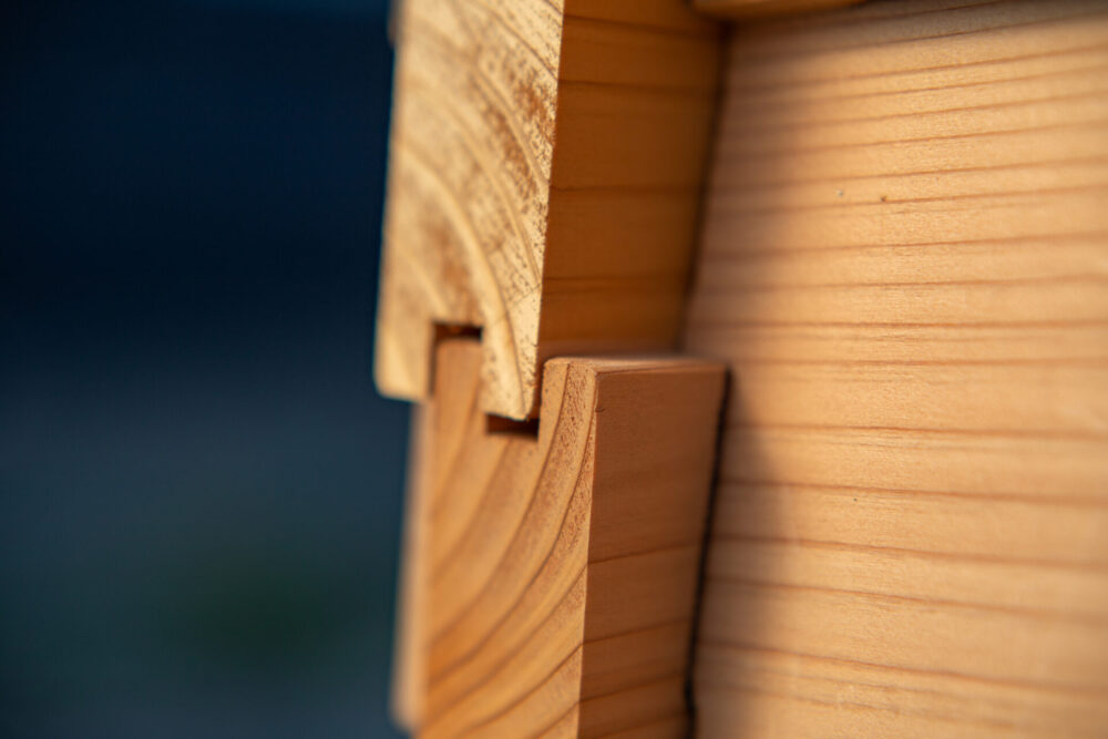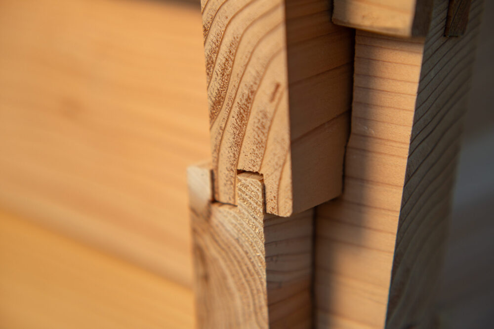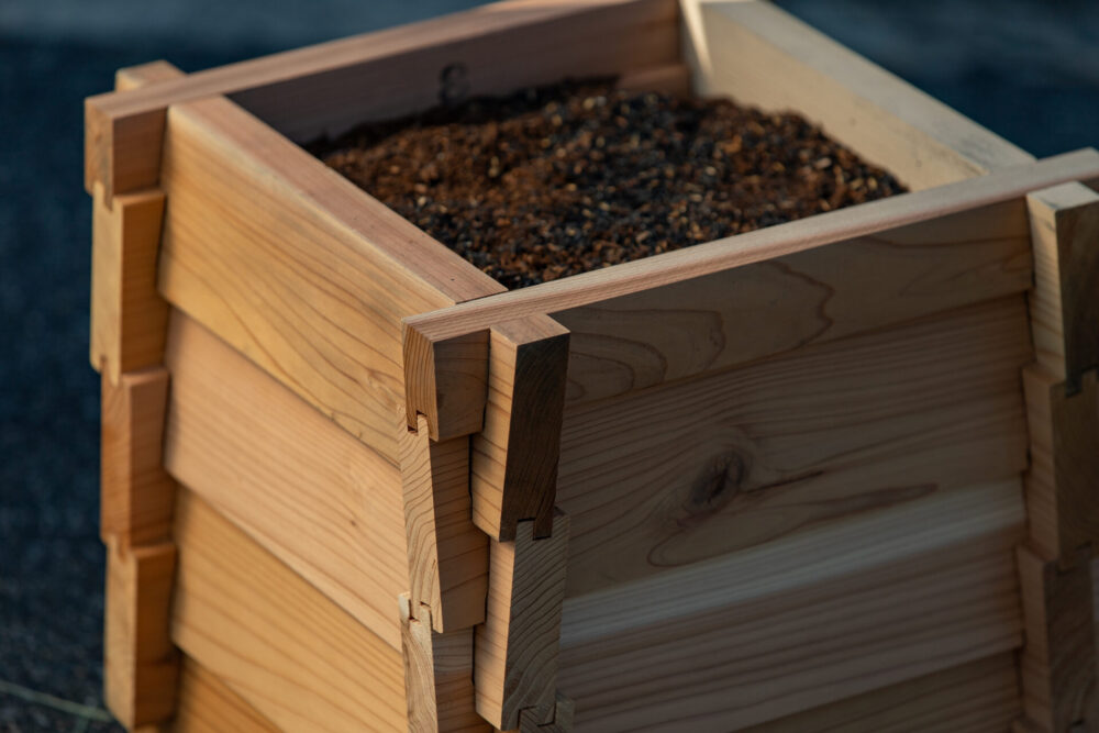 広島県産間伐材と地元のリサイクル資材を活用し、生ごみから堆肥を育む。暮らしの循環、いのちの循環に思いを寄せ、日本建築の伝統的な校倉造(あぜくらづくり)より着想を得た原始的な成り立ちでありながら現代の暮らしに溶け込むコンポスト。