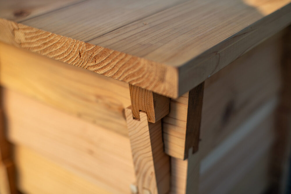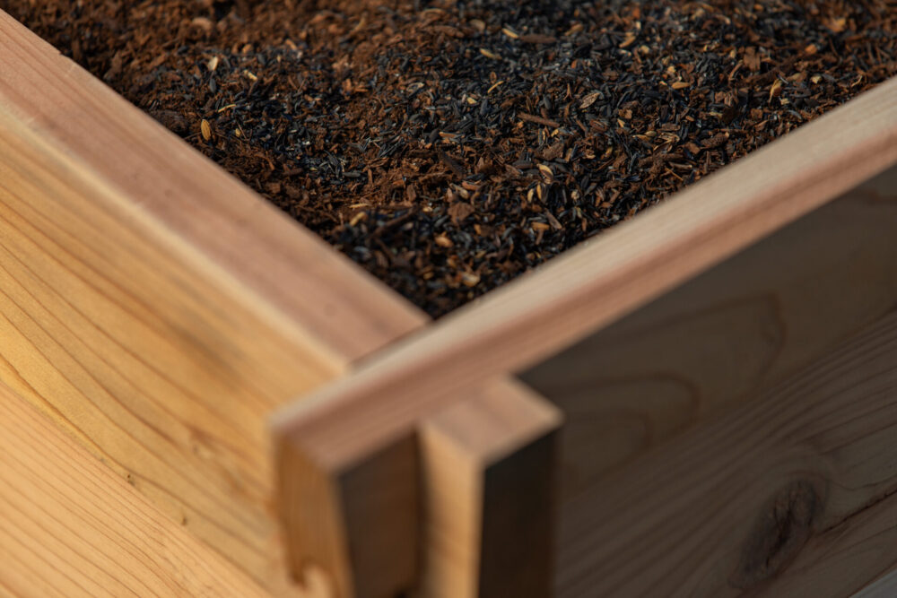 木製コンポストは他にもありますが、本製品は箱を構成する部材を角度をつけて組み上げる独自構造により、雨水の侵入を防ぎ、屋外設置時の匂い発生を抑制します。また、釘やビス、工具を一切使わず誰でも簡単に組み立てられるため、組み立ての手間を大幅に軽減しました。劣化した部材は、交換可能で長く使用できます。