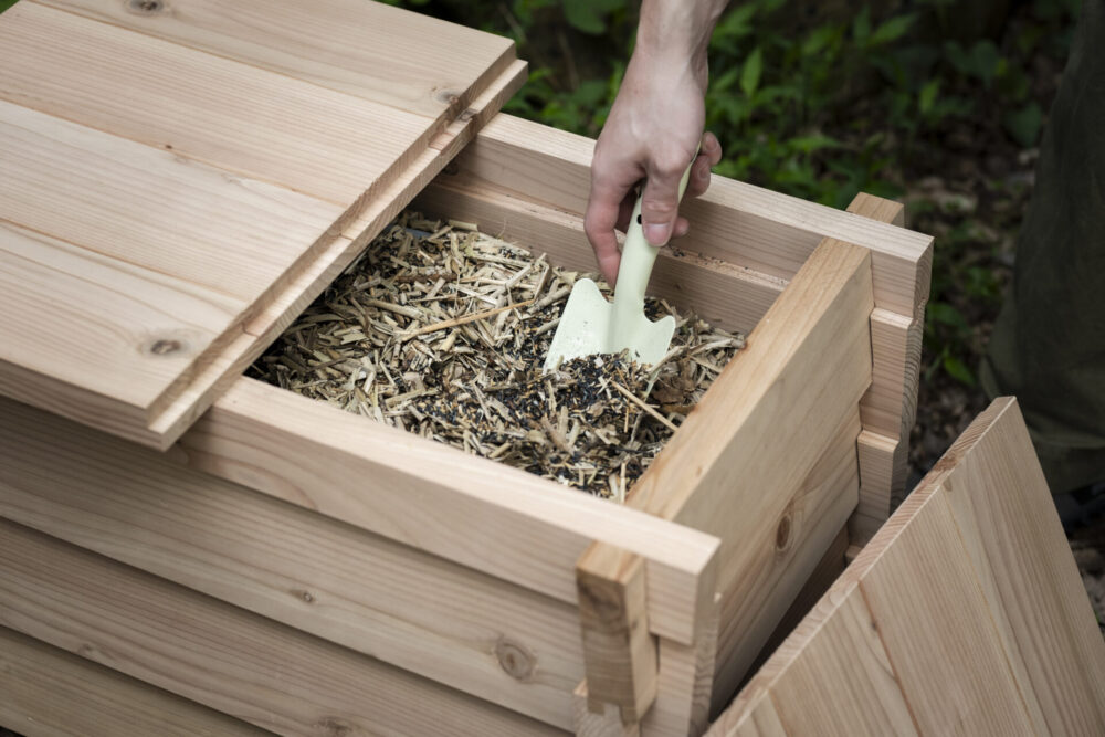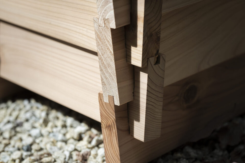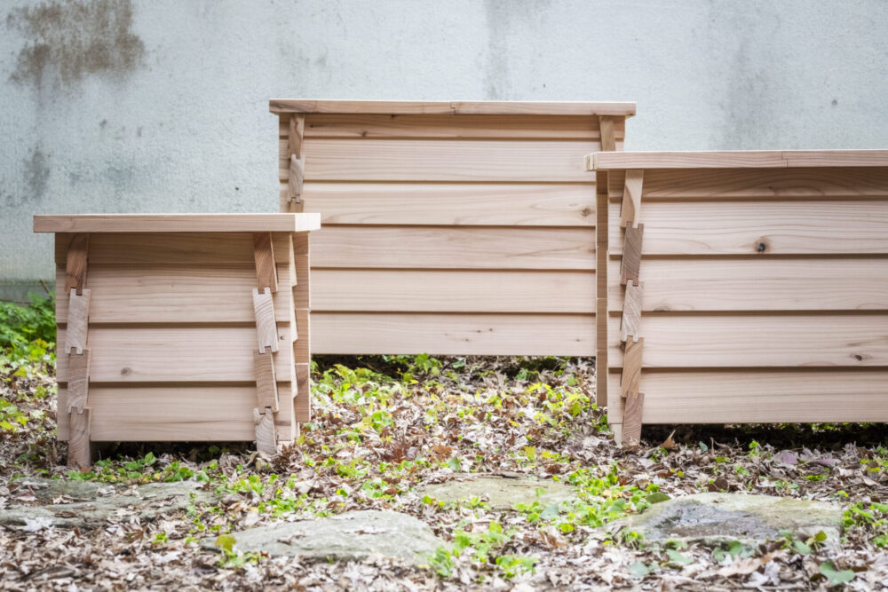 木製コンポストは他にもありますが、本製品は箱を構成する部材を角度をつけて組み上げる独自構造により、雨水の侵入を防ぎ、屋外設置時の匂い発生を抑制します。また、釘やビス、工具を一切使わず誰でも簡単に組み立てられるため、組み立ての手間を大幅に軽減しました。劣化した部材は、交換可能で長く使用できます。