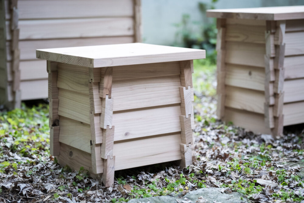 微生物の力を借りて残菜をたい肥化するコンポスト。釘やビス、工具を一切使わず誰でも簡単に組み立てられることが、人に道具への愛着を提供し、コンポスト導入を促している。養蜂箱や百葉箱を思い浮かべるデザインで建物や庭環境にも調和しやすく、構造的に存在感を感じられるインパクトがこの商品の魅力である。